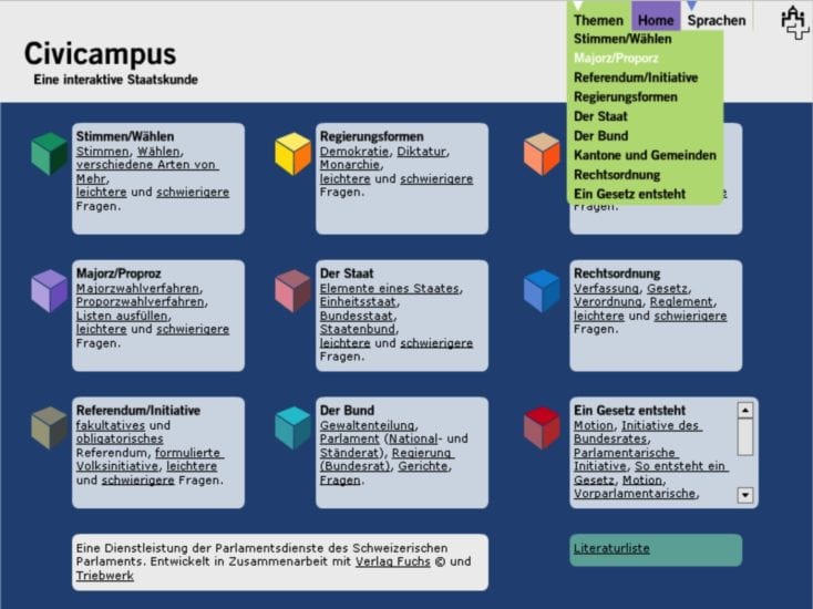 Civicampus – interaktive Staatskunde. CiviCampus entstand ursprünglich aus der Director-basierenden CD-ROM «Der Staat» des Verlag Fuchs‚. Dies wurde im Auftrag des Parlamentsdienstes des Schweizerischen Bundesparlament komplett überarbeitet, mit Flash in einem neuen grafischen Kleid, viersprachigen XML-Textdateien sowie mit neuen Interaktionen